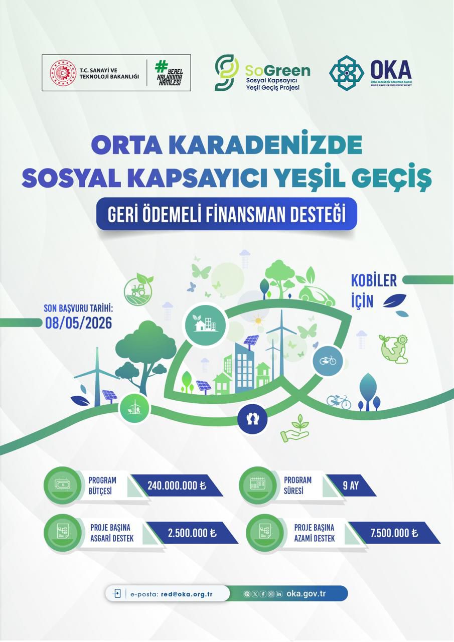 Detaylar: https://oka.gov.tr/duyuru/orta-karadenizde-sosyal-kapsayici-yesil-gecis-geri-odemeli-finansman-destegi-programi-ilan-edilmistir